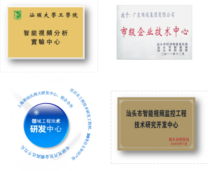 領域集團是汕頭市唯一市政府頒發智能視(shì)頻監控工程技(jì)術(shù)研究開(kāi)發中心、是廣東省智能監控工程重點實驗室,集團在汕頭和(hé)上(shàng)海設立了工程技(jì)術(shù)研究開(kāi)發中心,聘請(qǐng)海內(nèi)外高(gāo)科技(jì)專業人(rén)才加盟,并于高(gāo)校(xiào)科研合作(zuò),實施高(gāo)等校(xiào)研、科研基地、研發中心并軌研發戰略。